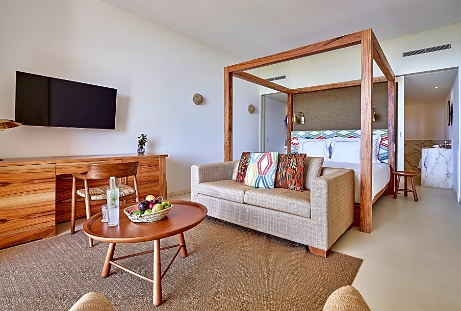 Ocean View Suite With Garden Terrace is 484 square feet and includes a king-size bed 150-183 width plus a sofa bed plus living room, tea and coffee making facilities , and slippers.